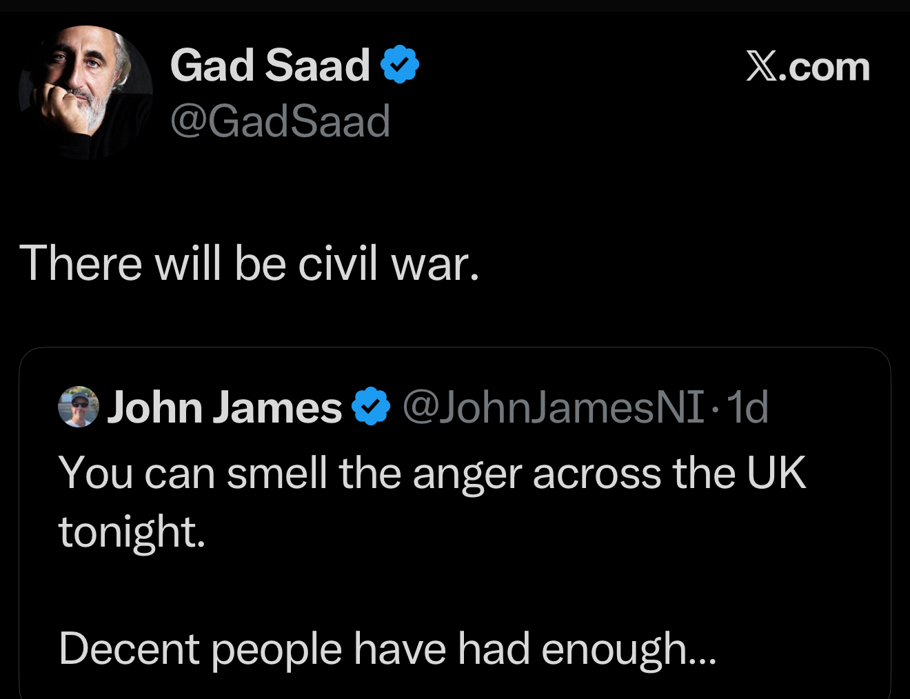 Psikolog Gad Saad, “There will be civil war.” (“Bir iç savaş olacak.”) paylaşımında bulundu.