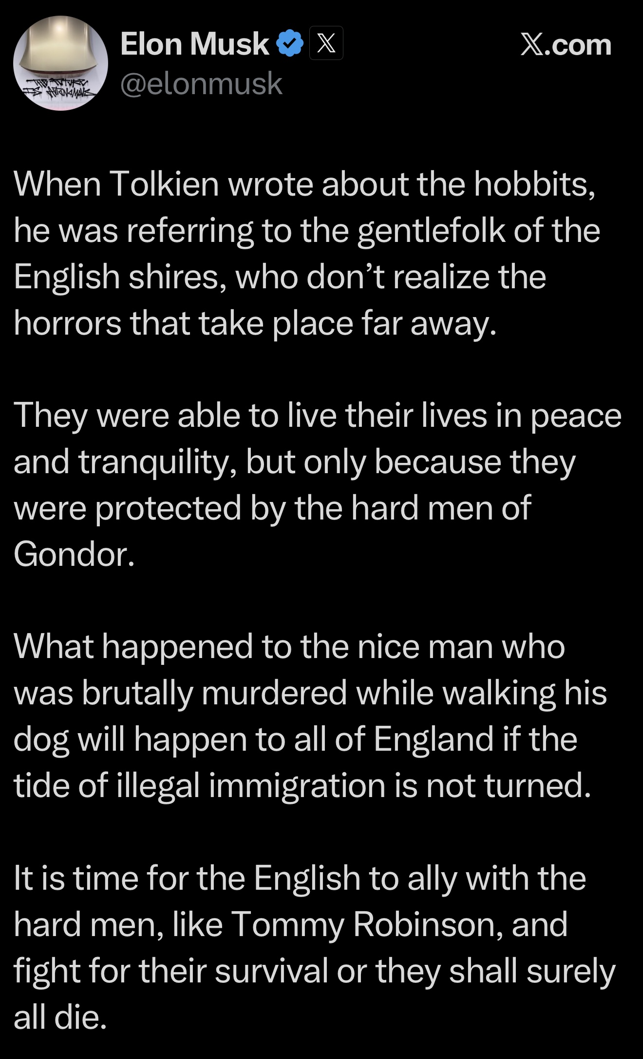 Elon Musk, X üzerinden yaptığı başka bir paylaşımda J.R.R. Tolkien’in “Yüzüklerin Efendisi” eserine atıfta bulundu: