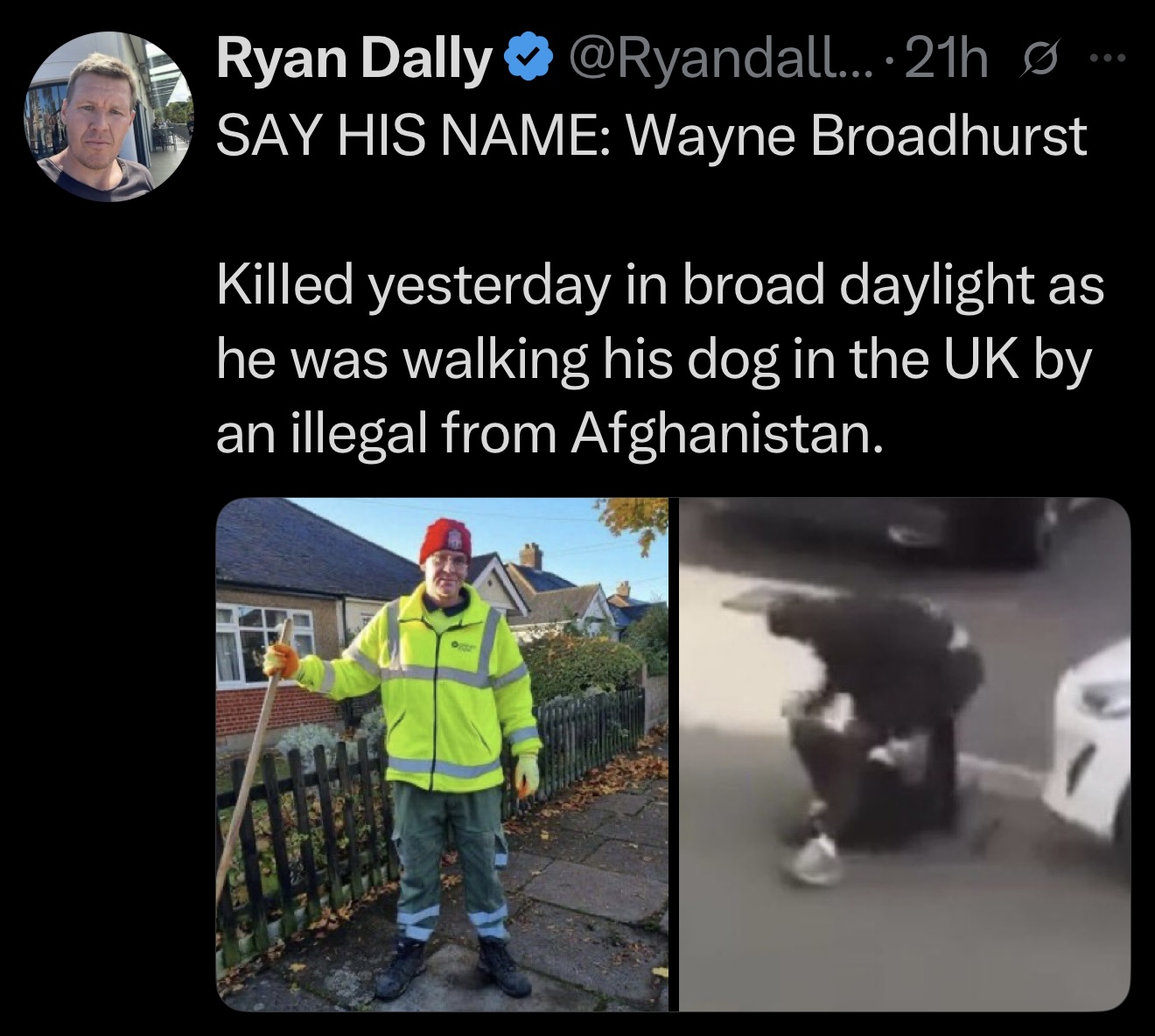 “What happened to the nice man who was brutally murdered while walking his dog will happen to all of England if the tide of illegal immigration is not turned.”