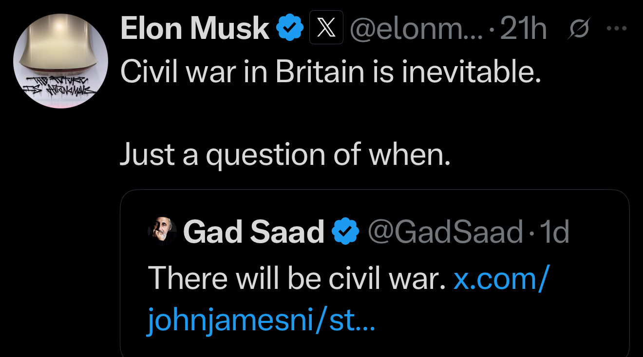 Elon Musk ise bu gönderiyi alıntılayarak “Civil war in Britain is inevitable. Just a question of when.” (“Britanya’da iç savaş kaçınılmaz. Sadece ne zaman olacağı meselesi.”) ifadelerini kullandı.
