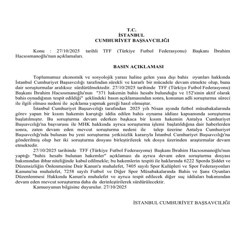 "Toplumumuz ekonomik ve sosyolojik yarası haline gelen yasa dışı bahis oyunları hakkında İstanbul Cumhuriyet Başsavcılığı tarafından sürekli ve kararlı bir mücadele devam etmekte olup, buna dair soruşturmalar aralıksız sürdürülmektedir. 27/10/2025 tarihinde TFF (Türkiye Futbol Federasyonu) Başkanı İbrahim Hacıosmanoğlu'nun "371 hakemin bahis hesabı bulunduğu ve 152'sinin aktif olarak bahis oynadığının tespit edildiği" şeklindeki basın açıklamasından sonra, konunun adli soruşturma süreci ile ilgili olması nedeni ile açıklama yapmak gereği hasıl olmuştur. İstanbul Cumhuriyet Başsavcılığı tarafından 2025 yılı Nisan ayında futbol müsabakalarında görev yapan bir kısım hakemin karıştığı iddia edilen bahis oynama iddiası kapsamında soruşturma başlatılmıştır. Bu soruşturma devam ederken başkaca bir kısım hakemin Antalya Cumhuriyet Başsavcılığı'na başvurusu ile MHK hakkında ayrıca soruşturma işlemi başlatıldığına dair haberlerden sonra, zaten devam eden mevcut soruşturma nedeni ile talep üzerine Antalya Cumhuriyet Başsavcılığı'nda bulunan bu yeni soruşturma yetkisizlik kararıyla İstanbul Cumhuriyet Başsavcılığı'na gönderilmiş olup her iki soruşturma dosyası birleştirilerek tek dosya üzerinden araştırmalar devam etmektedir. 27/10/2025 tarihinde TFF (Türkiye Futbol Federasyonu) Başkanı İbrahim Hacıosmanoğlu'nun yaptığı "bahis hesabı bulunan hakemler" açıklaması da ayrıca devam eden soruşturma dosyası bakımından ihbar niteliğinde kabul edilmekle; bu hakemlerin tespiti ile haklarında 6222 Sporda Şiddet ve Düzensizliğin Önlenmesine Dair Kanun'a muhalefet, 7405 sayılı Spor Kulüpleri ve Spor Federasyonları Kanunu'na muhalefet, 7258 sayılı Futbol ve Diğer Spor Müsabakalarında Bahis ve Şans Oyunları Düzenlenmesi Hakkında Kanun'a muhalefet ve ayrıca tespit edilecek diğer suç iddiaları bakımından devam eden mevcut soruşturma daha da derinleştirilerek sürdürülecektir." haber-20251027154028-516905.jpg158.01 KB